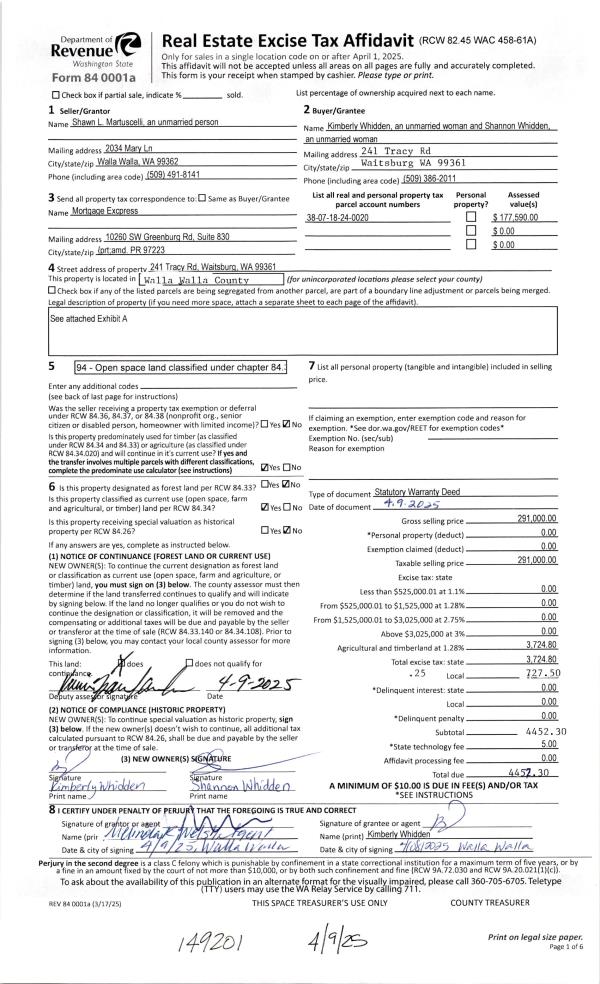 | 1 | 04/09/2025 | SWD | STATUTORY WARRANTY DEED | MARTUSCELLI SHAWN L | WHIDDEN KIMBERLY | | | $291,000.00 | 149201 | 2025-01880 |