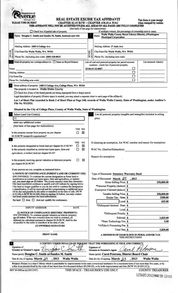 | 1 | 03/28/2013 | WARRANTY D | WARRANTY DEED | SMITH, DOUGLAS C & SANDRA M | WALLA WALLA COUNTY RURAL LIBRA | | | $250,000.00 | 123685 | 2013-02964 |
