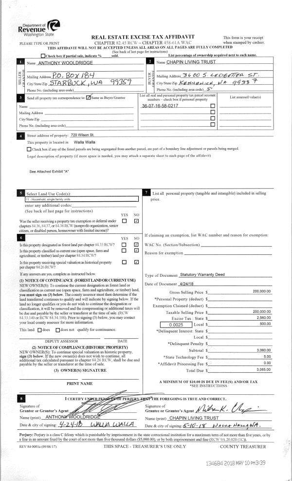 | 3 | 05/10/2018 | SWD | STATUTORY WARRANTY DEED | WOOLDRIDGE ANTHONY | THE CHAPIN LIVING TRUST | | | $200,000.00 | 134684 | 2018-03673 |