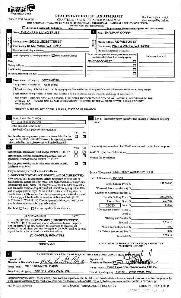 | 2 | 10/16/2019 | SWD | STATUTORY WARRANTY DEED | THE CHAPIN LIVING TRUST | CORRY SHALIMAR | | | $217,000.00 | 137875 | 2019-08295 |