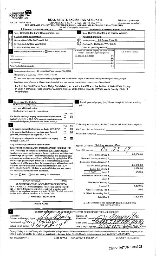 | 1 | 06/23/2017 | SWD | STATUTORY WARRANTY DEED | GRAND RIDGE LAND DEVELOPMENT INC | WORDEN THOMAS L & SHIRLEY A | | | $85,000.00 | 132652 | 2017-04815 |