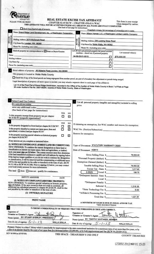 | 3 | 05/01/2013 | WARRANTY D | WARRANTY DEED | GRAND RIDGE LAND DEVELOPMENT I | ALLISON HOMES LLC | | | $79,500.00 | 123892 | 2013-04308 |