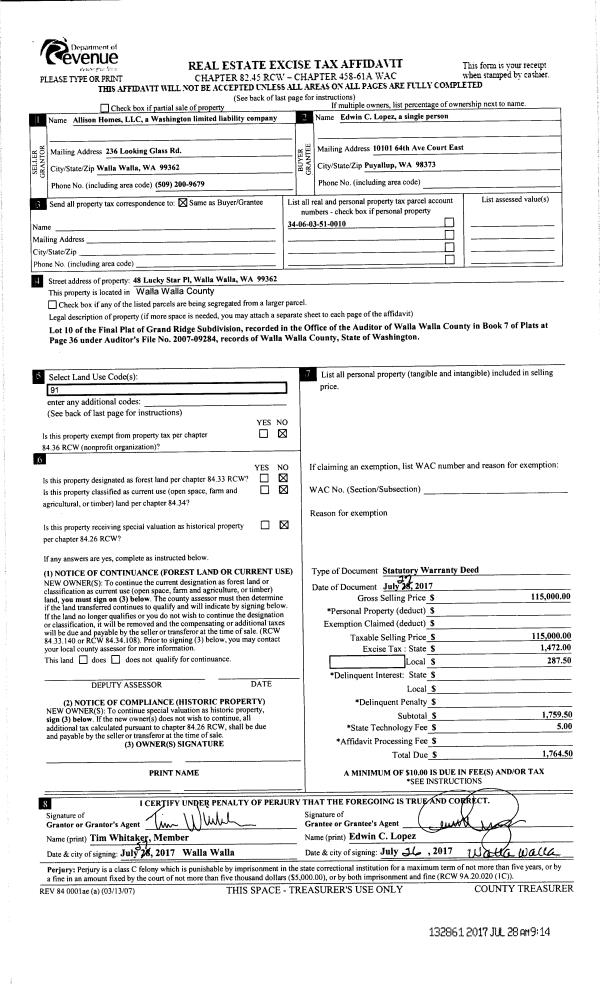 | 2 | 07/28/2017 | SWD | STATUTORY WARRANTY DEED | ALLISON HOMES LLC | LOPEZ EDWIN C | | | $115,000.00 | 132861 | 2017-05733 |