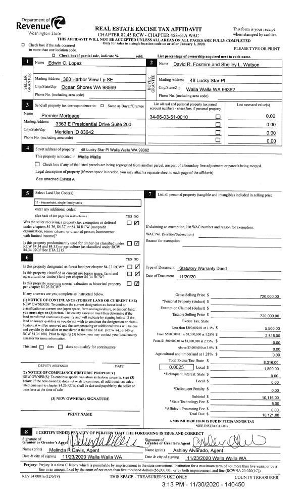 | 1 | 11/30/2020 | SWD | STATUTORY WARRANTY DEED | LOPEZ EDWIN C | FOSMIRE DAVID R & SHELLEY L WATSON | | | $720,000.00 | 140450 | 2020-12628 |