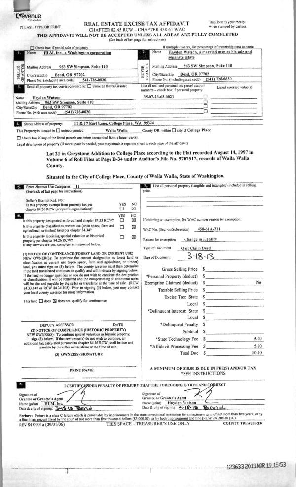 | 4 | 03/19/2013 | QCD | QUIT CLAIM DEED | HLM INC | WATSON, HAYDEN | | | $0.00 | 123633 | 2013-02599 |