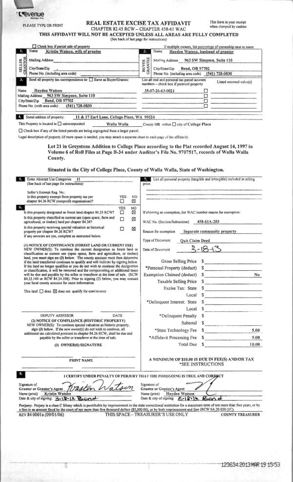 | 5 | 03/19/2013 | QCD | QUIT CLAIM DEED | WATSON, KRISTIN | WATSON, HAYDEN | | | $0.00 | 123634 | 2013-02600 |
