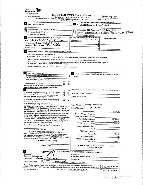 | 3 | 10/22/2019 | SWD | STATUTORY WARRANTY DEED | WATSON HAYDEN | PRITCHARD DAVID & BREANA | | | $367,500.00 | 137918 | 2019-08488 |