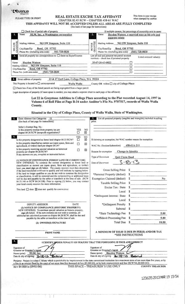 | 3 | 03/19/2013 | QCD | QUIT CLAIM DEED | HLM INC | WATSON, HAYDEN | | | $0.00 | 123635 | 2013--02596 |