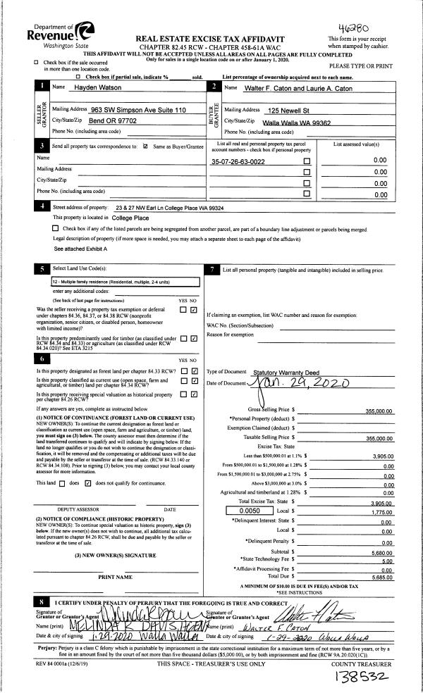 | 1 | 01/31/2020 | SWD | STATUTORY WARRANTY DEED | WATSON HAYDEN | CATON WALTER F & LAURIE A | | | $355,000.00 | 138532 | 2020-00929 |