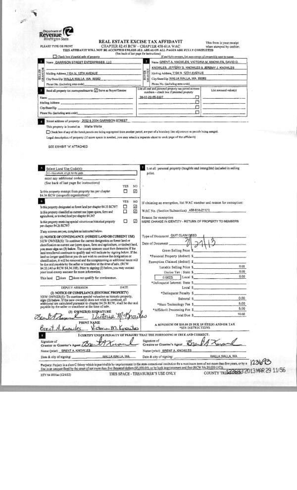 | 3 | 03/29/2013 | QCD | QUIT CLAIM DEED | GARRISON STREET ENTERPRISES LL | KNOWLES, BRENT & VICTORIA N | | | $0.00 | 123693 | 2013-03041 |