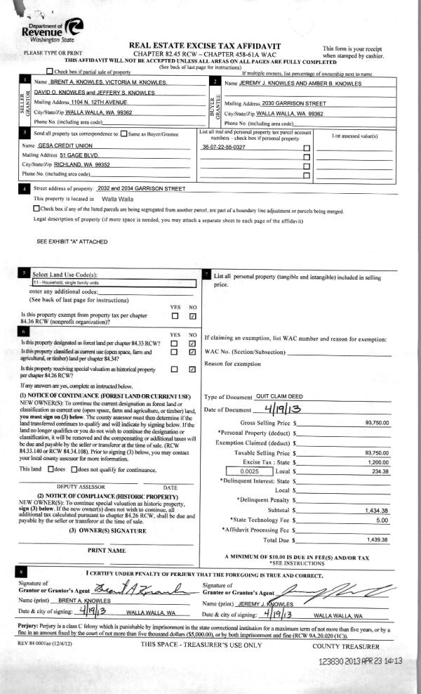 | 2 | 04/23/2013 | QCD | QUIT CLAIM DEED | KNOWLES, BRENT & VICTORIA N ET | KNOWLES, JEREMY J & AMBER B | | | $93,750.00 | 123830 | 2013-03968 |