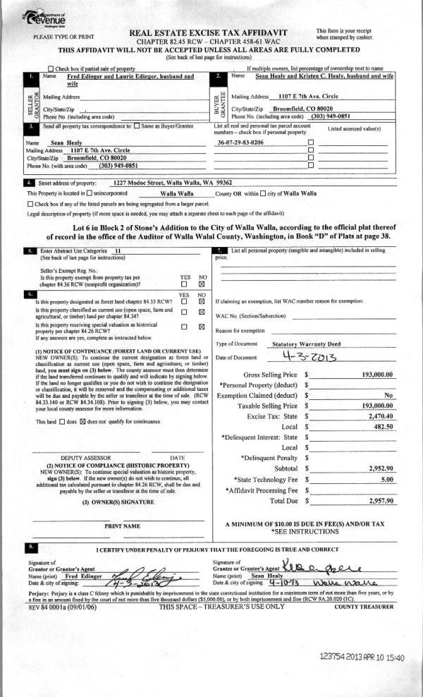 | 1 | 04/10/2013 | WARRANTY D | WARRANTY DEED | EDINGER, FRED & LAURIE | HEALY, SEAN & KRISTEN C | | | $193,000.00 | 123754 | 2013-03436 |
