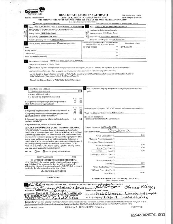 | 2 | 10/01/2012 | WARRANTY D | WARRANTY DEED | EDINGER, FRED & LAURIE | EDINGER, FRED & LAURIE | | | $0.00 | 122742 | 2012-08649 |