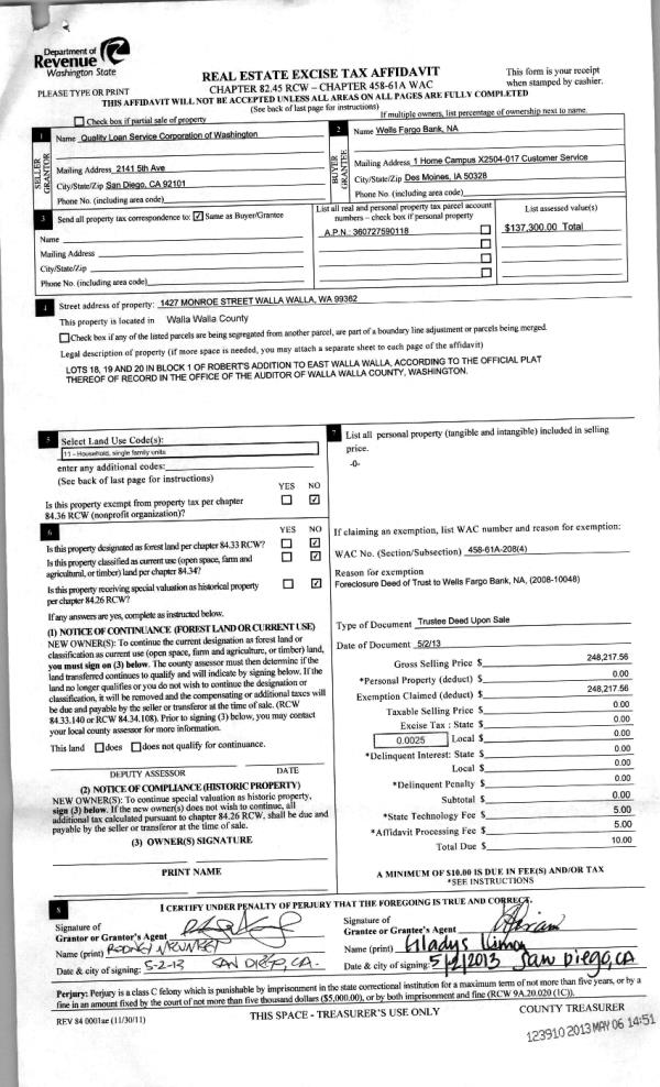 | 5 | 05/06/2013 | WARRANTY D | WARRANTY DEED | QUALITY LOAN SERVICE CORP OF W | WELLS FARGO BANK NA | | | $248,217.00 | 123910 | 2013-04511 |