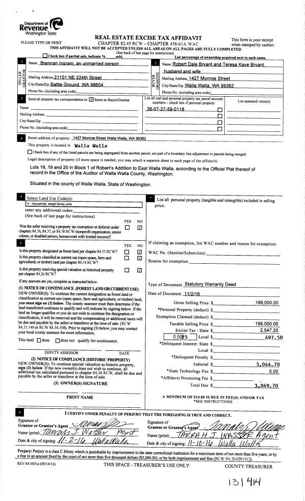 | Property ID: | 35154 | Abbreviated Legal Description: | EAST WALLA WALLA ROBERTS LOTS 18, 19, & 20 BLK 1 |