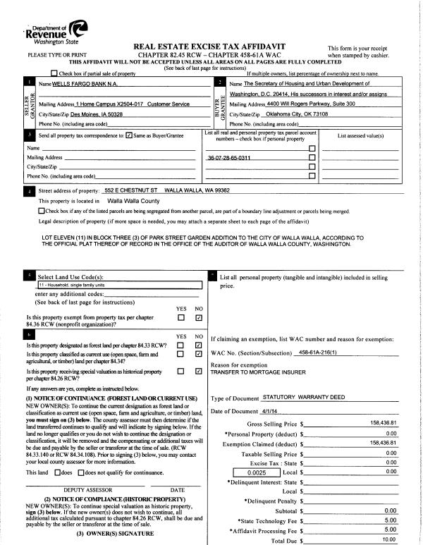 | 4 | 04/01/2014 | SWD | STATUTORY WARRANTY DEED | WELLS FARGO BANK NA | SECRETARY OF HOUSING & URBAN DEV | | | $158,436.00 | 126966 | 2014-08402 |