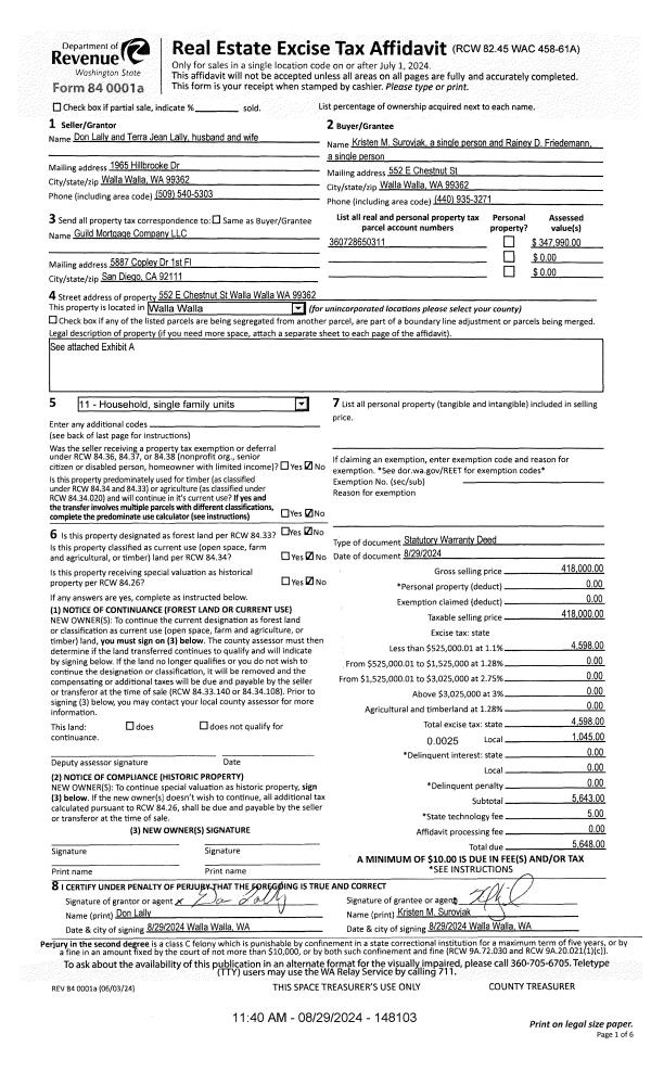 | 2 | 08/29/2024 | SWD | STATUTORY WARRANTY DEED | LALLY DON & TERRA J | SUROVJAK KRISTEN M | | | $418,000.00 | 148103 | 2024-04853 |