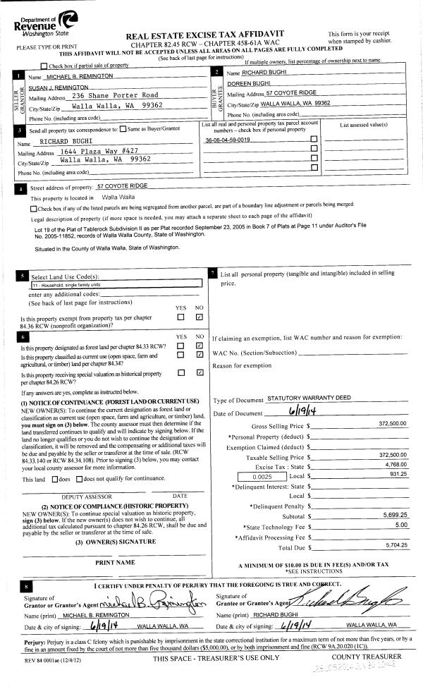 | 3 | 06/21/2014 | SWD | STATUTORY WARRANTY DEED | REMINGTON MICHAEL B & SUSAN J | BUGHI RICHARD & DOREEN | | | $372,500.00 | 126105 | 2014-04257 |