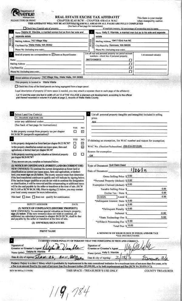 | 4 | 02/25/2011 | QCD | QUIT CLAIM DEED | WAMBLE, DELPHA M | WAMBLE, KELLY S | | | | 119784 | 2011-01754 |