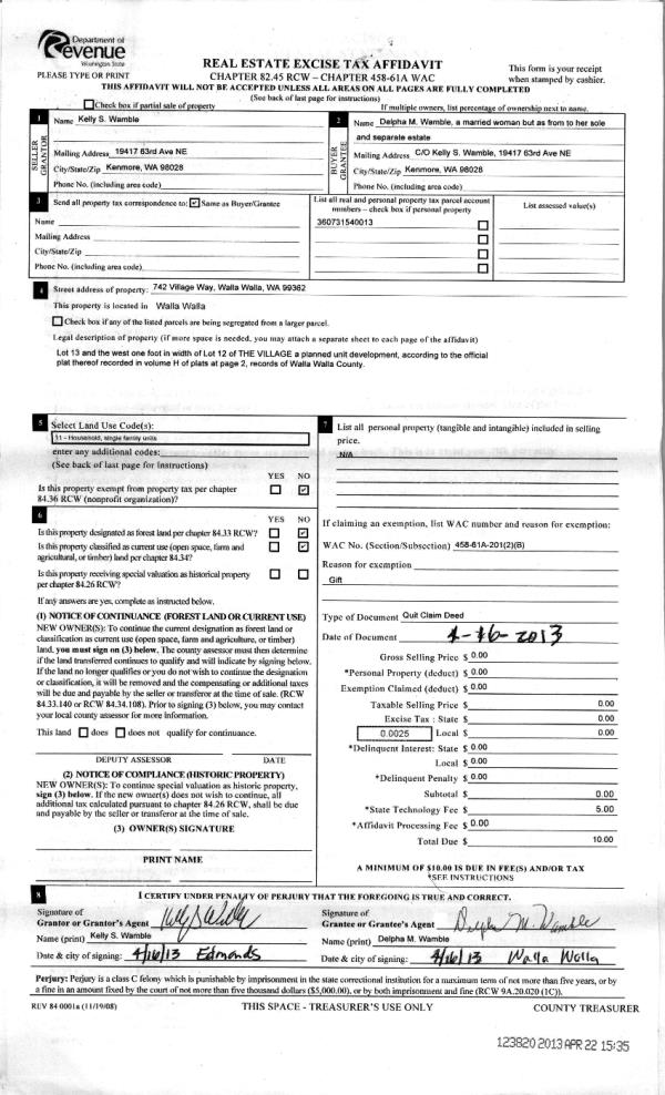 | 3 | 04/22/2013 | QCD | QUIT CLAIM DEED | WAMBLE, KELLY S | WAMBLE, DELPHA M | | | $0.00 | 123820 | 2013-03934 |