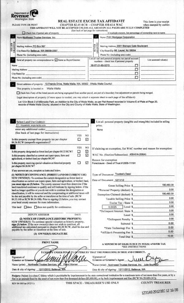 | 6 | 12/12/2012 | WARRANTY D | WARRANTY DEED | NORTHWEST TRUSTEE SERVICES INC | PHH MORTGAGE CORPORATION | | | $190,483.00 | 123148 | 2012-11088 |