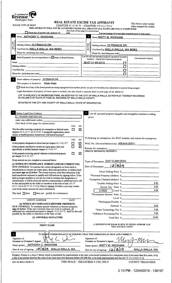 | 1 | 12/04/2019 | QCD | QUIT CLAIM DEED | WICKHAM ANTHONY C | WICKHAM MISTY M | | | | 138197 | 2019-10049 |