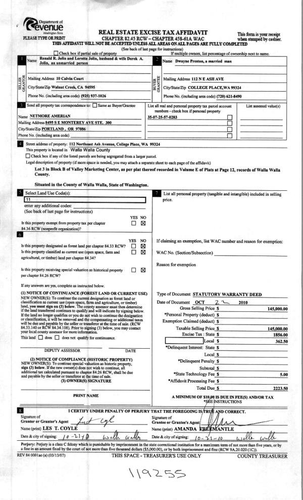| 3 | 10/27/2010 | WARRANTY D | WARRANTY DEED | JOLIN, RONALD R & LORETTA | PRESTON, DWAYNE E | | | $145,000.00 | 119255 | 2010-08733 |