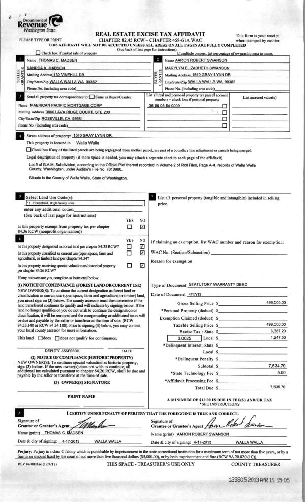 | 3 | 04/19/2013 | WARRANTY D | WARRANTY DEED | MADSEN, THOMAS C & SANDRA K | SWANSON, AARON ROBERT | | | $499,000.00 | 123805 | 2013-03809 |