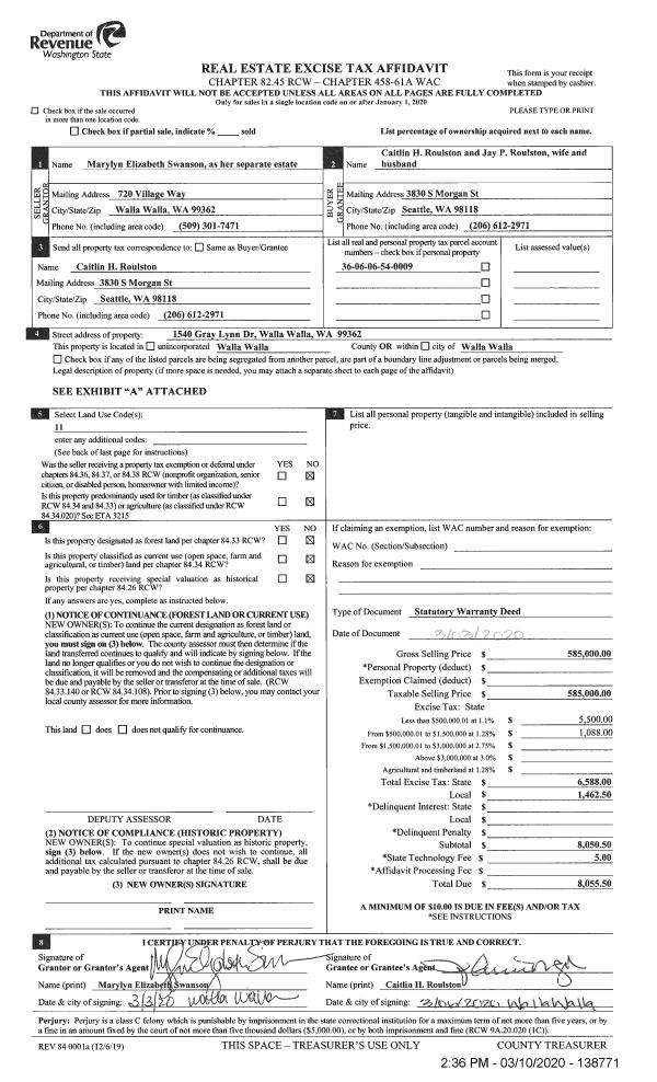 | 1 | 03/10/2020 | SWD | STATUTORY WARRANTY DEED | SWANSON MARYLYN ELIZABETH | ROULSTON CAITLIN H & JAY P | | | $585,000.00 | 138771 | 2020-02215 |