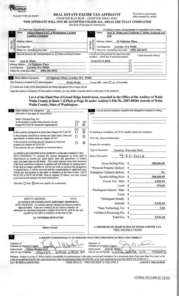 | 3 | 04/26/2013 | WARRANTY D | WARRANTY DEED | ALLISON HOMES LLC | MEHN, JACK & CATHERINE J | | | $388,000.00 | 123846 | 2013-04096 |