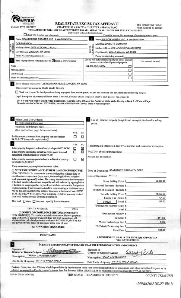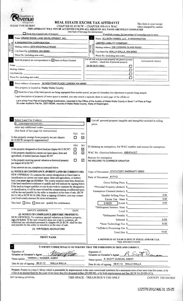 | 4 | 08/31/2012 | WARRANTY D | WARRANTY DEED | GRAND RIDGE LAND DEVELOPMENT I | ALLISON HOMES LLC | | | $0.00 | 122578 | 2012-07697 |