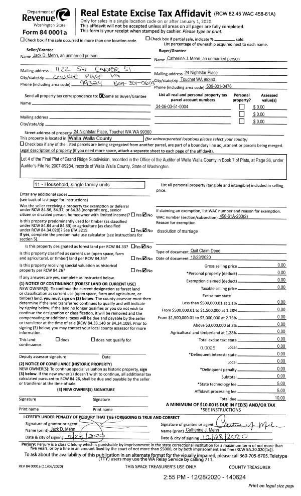 | 2 | 12/23/2020 | QCD | QUIT CLAIM DEED | MEHN JACK & CATHERINE J | MEHN CATHERINE J | | | $0.00 | 140624 | 2020-13831 |