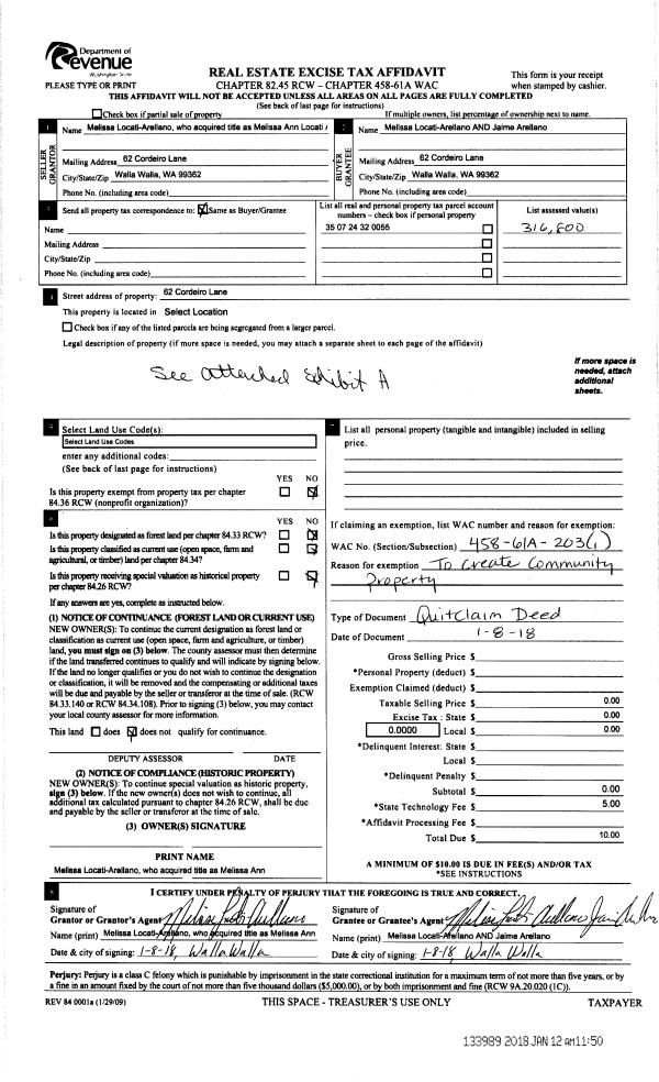 | 1 | 01/08/2018 | QCD | QUIT CLAIM DEED | LOCATI MELISSA A | ARELLANO JAIME & MELISSA LOCATI | | | $0.00 | 133989 | 2018-00340 |