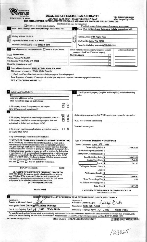 | 3 | 04/22/2013 | WARRANTY D | WARRANTY DEED | OLDRIDGE, JASON & LINDSEY | KOLUDA, PAUL M & DEBORAH A | | | $136,625.00 | 123825 | 2013-03937 |