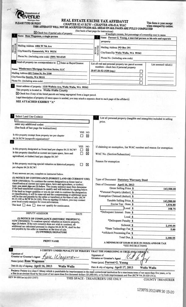 | 3 | 04/30/2013 | WARRANTY D | WARRANTY DEED | WAGEMAN, ROSE M | YOUNG, FORREST G | | | $143,500.00 | 123878 | 2013-04273 |
