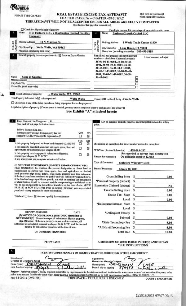 | 1 | 05/07/2013 | WARRANTY D | WARRANTY DEED | HW PARTNERS LLC | | 9-PARCELS | | $2,300,000.00 | 123916 | 2013-04528 |