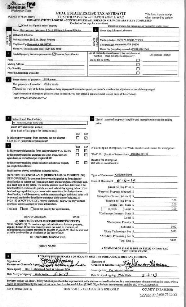 | 3 | 05/09/2013 | QCD | QUIT CLAIM DEED | JOHNSON, WILLIAM B | LEHMANN, KAY JOHNSON | | | $0.00 | 123922 | 2013-04645 |