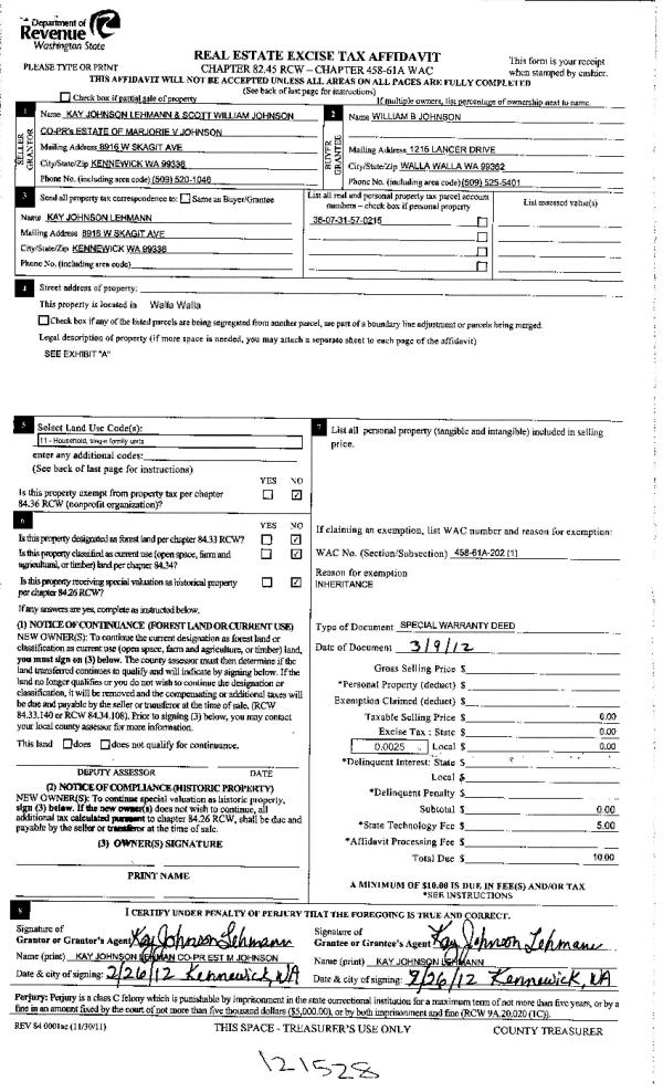 | 4 | 03/14/2012 | WARRANTY D | WARRANTY DEED | JOHNSON, MARJORIE V ESTATE OF | JOHNSON, WILLIAM B | | | | 121528 | 2012-02139 |