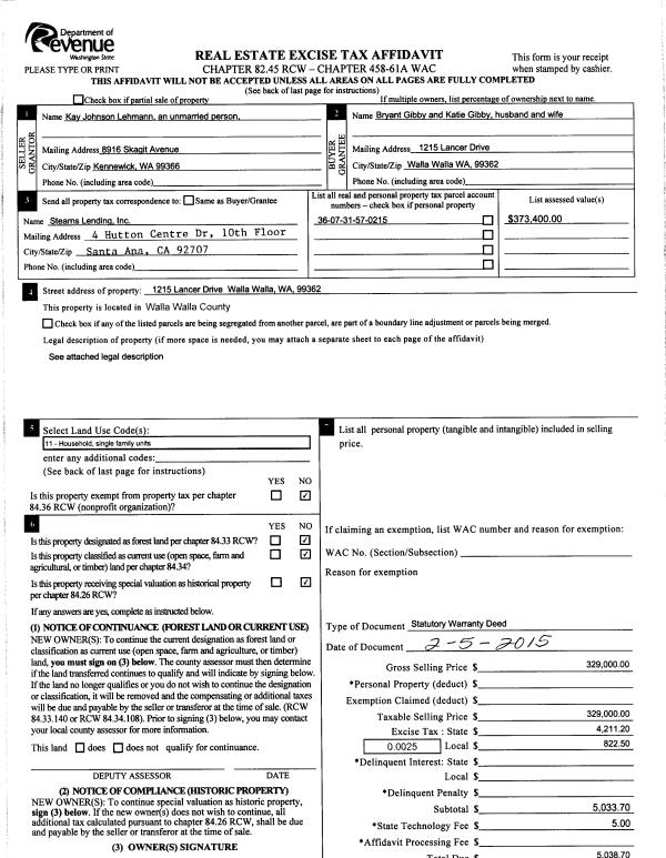 | 2 | 02/06/2015 | SWD | STATUTORY WARRANTY DEED | LEHMANN KAY JOHNSON | GIBBY BRYANT & KATIE | | | $329,000.00 | 127403 | 2015-01253 |