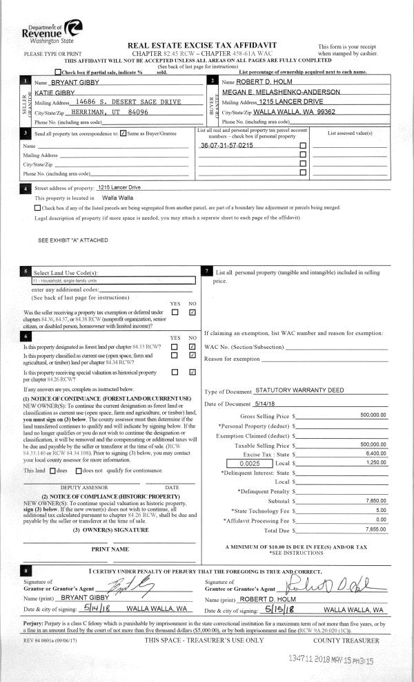 | Mailing Address: | MEGAN E MELASHENKO-ANDERSON 1215 LANCER DR WALLA WALLA, WA 99362 | % Ownership: | 100.0000000000% |