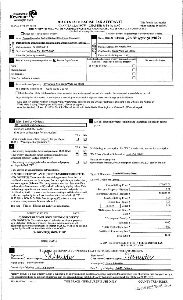 | 1 | 06/05/2015 | SWP | Special Warranty Deed | FEDERAL NATIONAL MORTGAGE ASSOC | RODRIGUEZ RODOLFO | | | $170,000.00 | 128116 | 2015-04759 |