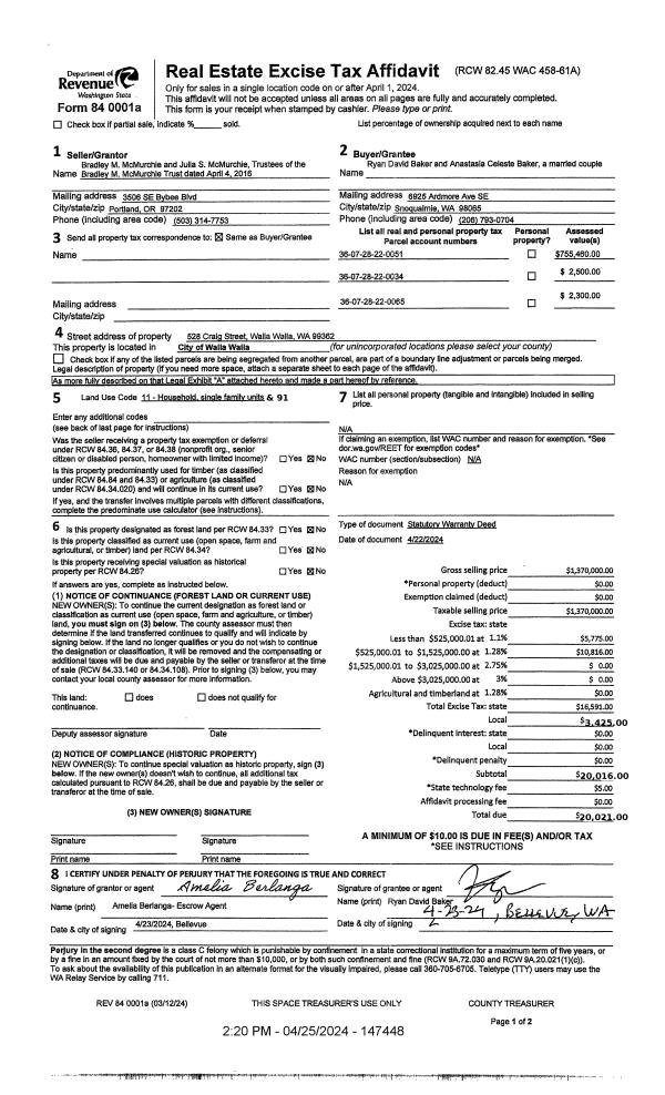 | 1 | 04/25/2024 | SWD | STATUTORY WARRANTY DEED | MC MURCHIE BRADLEY M TRUST | BAKER RYAN DAVID & ANASTASIA CELESTE | | 3-PARCLES | $1,370,000.00 | 147448 | 2024-02100 |