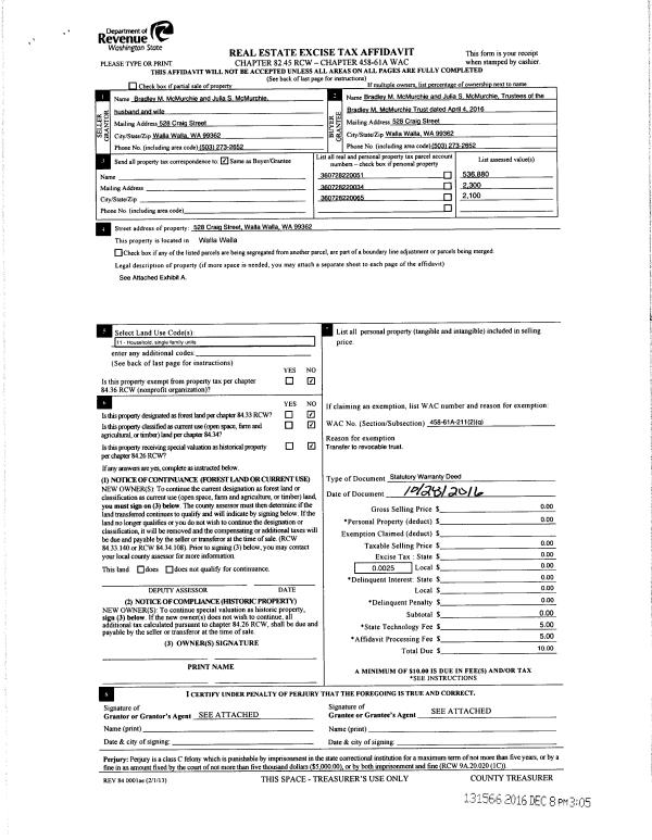 | 2 | 10/28/2016 | SWD | STATUTORY WARRANTY DEED | MC MURCHIE BRADLEY M & JULIA S | MC MURCHIE BRADLEY M TRUST | | | $0.00 | 131566 | 2016-10084 |
