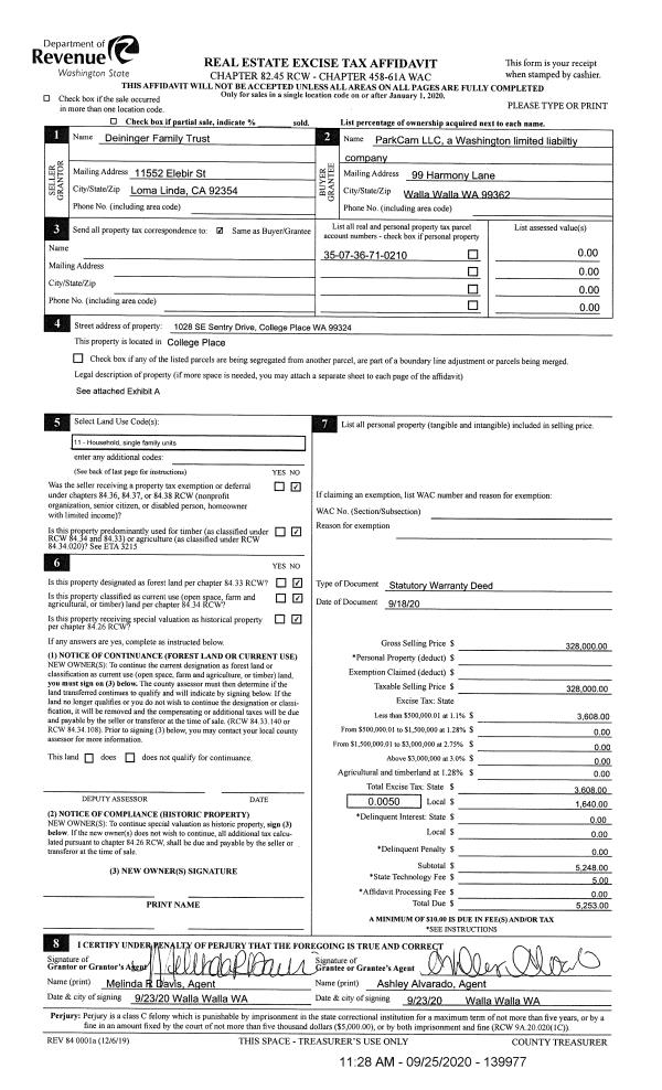 | 1 | 09/25/2020 | SWD | STATUTORY WARRANTY DEED | DEININGER FAMILY TRUST | PARKCAM LLC | | | $328,000.00 | 139977 | 2020-09799 |