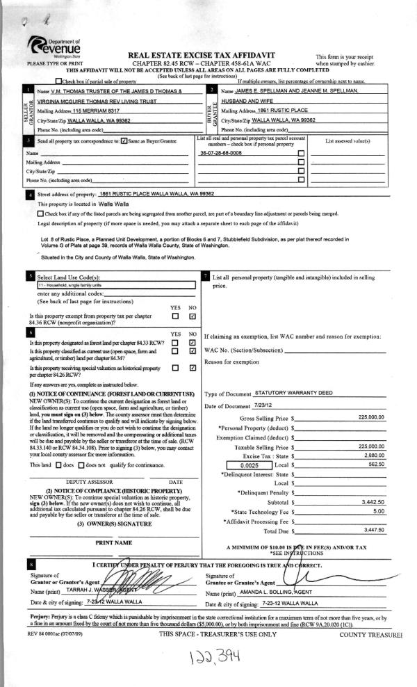 | 3 | 07/26/2012 | WARRANTY D | WARRANTY DEED | THOMAS, J D & V M AS TRUSTEES | SPELLMAN, JAMES E & JEANNE M | | | $225,000.00 | 122394 | 2012-06364 |