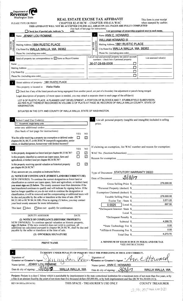 | 1 | 03/06/2017 | SWD | STATUTORY WARRANTY DEED | ROMINE JENNY LOU | HOWARD WILLLIAM III & ANN C | | | $279,000.00 | 131991 | 2017-01753 |