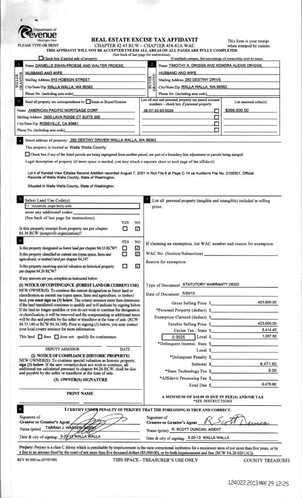 | 2 | 05/29/2013 | WARRANTY D | WARRANTY DEED | FROESE, WALTER | DRIGGS, TIMOTHY A & XONDRA ALE | | | $423,000.00 | 124022 | 2013-05351 |