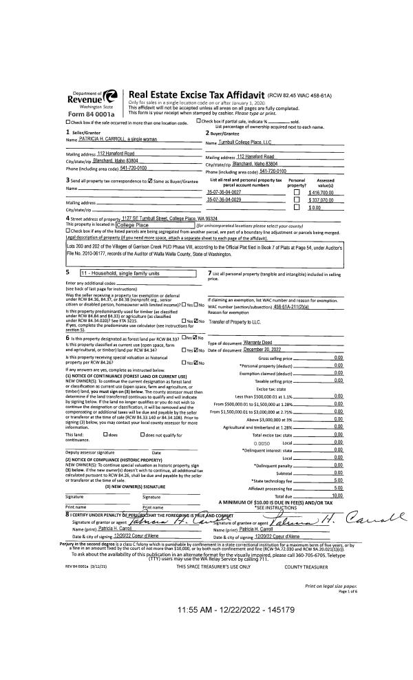 | 2 | 12/22/2022 | WARRANTY D | WARRANTY DEED | CARROLL PATRICIA H | TURNBULL COLLEGE PLACE LLC | | 2-PARCELS | | 145179 | 2022-09682 |