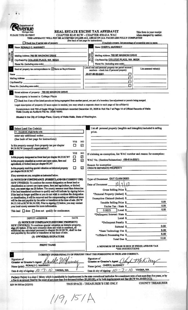 | 2 | 10/08/2010 | QCD | QUIT CLAIM DEED | MC KINNEY, RONALD C | MC KINNEY, CHERYL | | | $0.00 | 119151 | 2010-08080 |