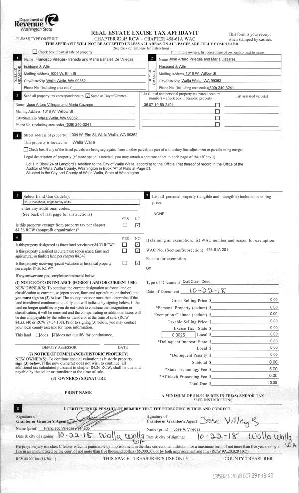 | 1 | 10/22/2018 | QCD | QUIT CLAIM DEED | VILLEGAS-TRENADO FRANCISCO | VILLEGAS JOSE ARTURO | | | $0.00 | 135821 | 2018-08957 |